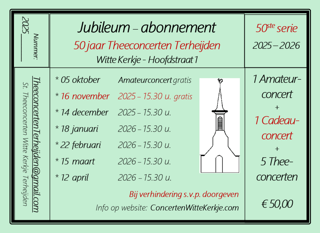 Informatie op Website theeconcerten: https://concertenwittekerkje.com